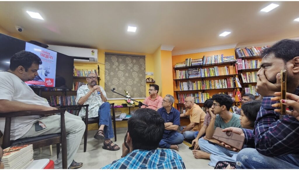 দোকানটি ইতিমধ্যেই লোকে ঠেসে গেছিল। সন্ধ্যা নেমে গেছে শহরে৷ উদ্যোক্তাদের তরফেও অগণিত লোককে কীভাবে জায়গা দেবেন তা নিয়ে চিন্তা ছিলই আগে থেকে। কিন্তু নানা বয়সী প্রবীণ ও নবীন ব্যতিক্রমী মানুষের জমায়েতে কী আবেগ যে খেলে গেল চকিতে। অঞ্জন আমার প্রশ্নের উত্তরে বলছিলেন – যখন নাটক করতে এলেন সত্তর দশকে, কীভাবে অজিতেশ বা উৎপলদের নাটকগুলো তাঁর ইন্টারপ্রিটেশানে অন্য অর্থ নিয়ে আসছিল। কীভাবে সত্যজিৎ বা সন্দীপনদের লেখা অনুপ্রাণিত করলেও শব্দ ও ইমেজগুলো নিজের জীবন থেকে মরিয়া হয়ে খুঁজছিলেন তিনি। কীভাবে নিজের শহরের কোনও রাস্তাতেই খুঁজে পেয়েছেন দুনিয়াকে, একই শব্দ যখন লিখেছেন ও ছবি করেছেন কীভাবে বদলে গেছে ওজন। বলছিলেন, মৃণালবাবুর কথামত জীবনে ও শিল্পে অল্প টাকার ওপর আস্থা রাখায় কীভাবে মৌলিকতার স্বাধীনতা ক্রমশ খুলে গেছে তাঁর জীবনে…