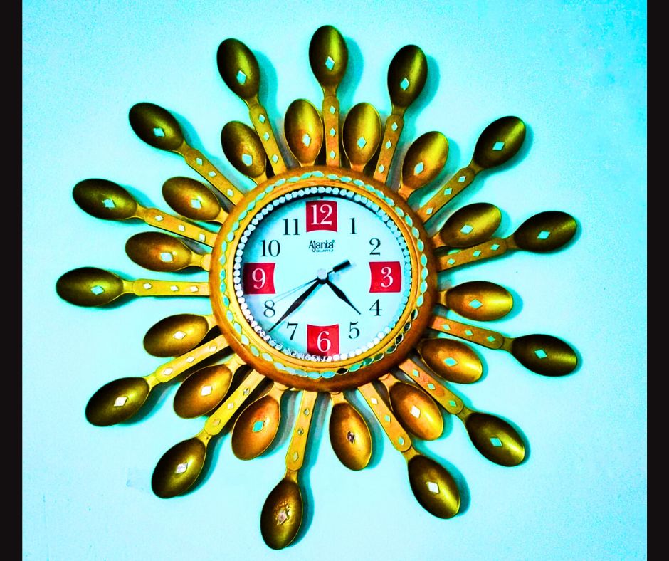 পদ্ধতি – প্লাস্টিকের চামচ নিয়ে ( অর্ধেক চামচ গোটা রাখতে হবে আর বাকি অর্ধেক চামচ মাঝখান থেকে ভেঙে নিতে হবে) স্প্রে রঙ দিয়ে পুরো রঙ করে নিতে হবে।একটা ছোট গোল ঘড়ির চারপাশে ওই একই রঙ দিয়ে স্প্রে করে নিতে হবে। চামচের রঙ ভালো করে শুকিয়ে গেলে গোটা চামচগুলোর নীচের দিকে ফেভিকল লাগিয়ে ঘড়ির চারপাশে গোল করে পিছনদিকে একটু ফাঁক ফাঁক করে লাগিয়ে নিতে হবে। এরপর বাকি অর্ধেক চামচ যেগুলো মাঝখান থেকে ভেঙে রাখা ছিল, সেগুলো নিচের দিকে ফেভিকল লাগিয়ে দুটো লম্বা চামচের মাঝে যে ফাঁকটা আছে, সেখানে লাগিয়ে নিতে হবে। ফেভিকল ভালো করে শুকিয়ে গেলে চামচগুলোর মধ্যে ছোট ছোট আয়না লাগিয়ে নিজের মতো সাজিয়ে নিতে হবে।