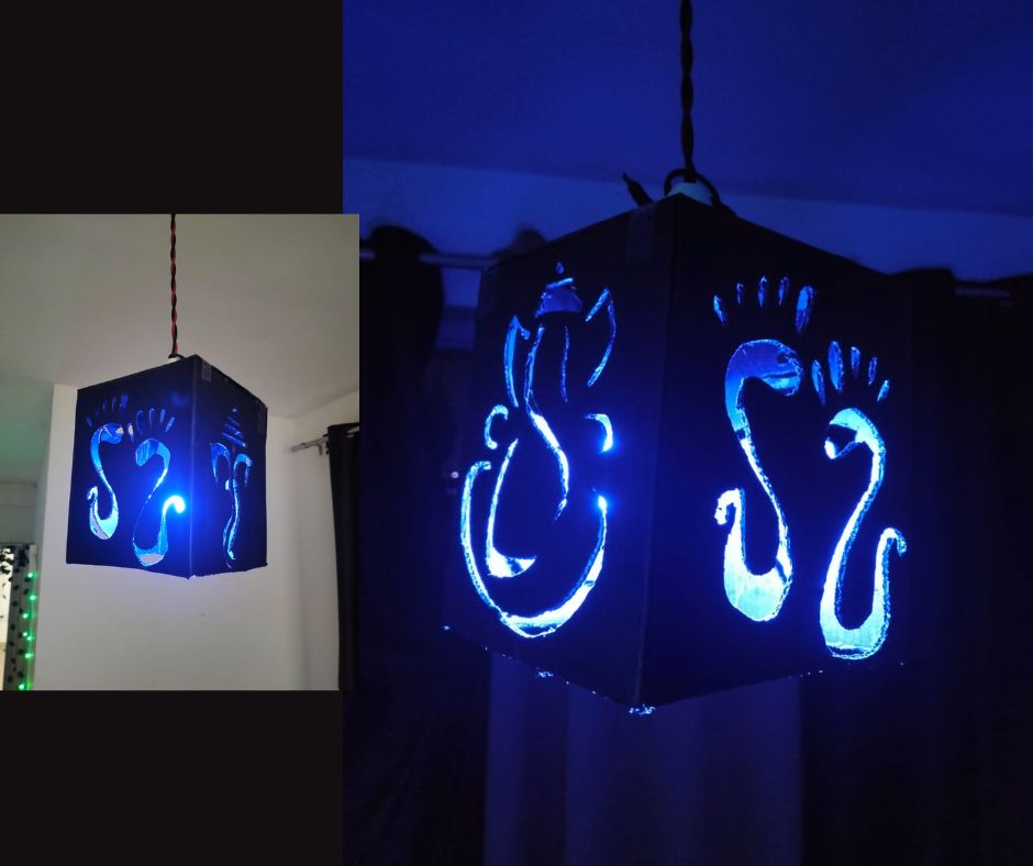 পদ্ধতি- বাক্সটার নীচের দিক কেটে নিতে হবে। এবার চারদিকে সুন্দর করে এঁকে নিতে হবে (আমি গনেশের মুখ এঁকেছি, নিজের ইচ্ছেমতো এঁকে নেওয়া যাবে ) এই আঁকার উপর দিয়ে আস্তে আস্তে সরু কাটার দিয়ে কেটে নিতে হবে। কেটে নেওয়ার পর বাক্সটাকে পুরো রঙ করে শুকিয়ে নিতে হবে (ভেতরের দিকেও রং করতে হবে)। এরপর বাক্সটার উপরের দিকে গোল করে কেটে নিয়ে তাতে হোল্ডার লাগিয়ে নিতে হবে এবং নীচের দিক থেকে বাল্ব লাগিয়ে ইলেকট্রিক তারের মাধ্যমে ঝুলিয়ে দিতে হবে। তৈরি ঝুলন্ত ল্যাম্প শেড।