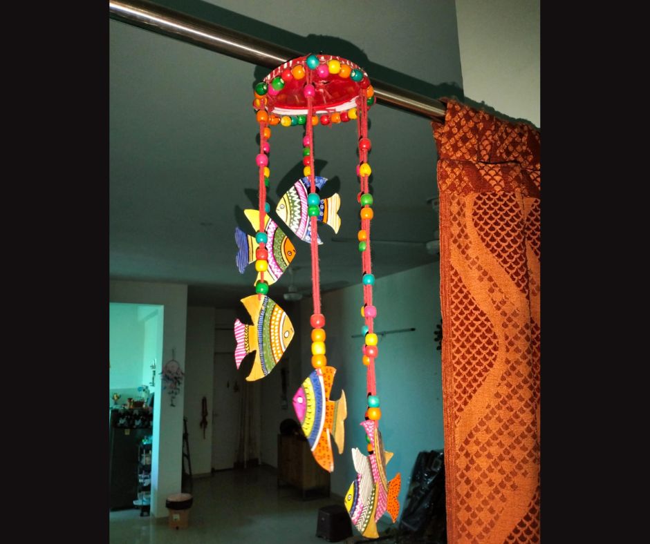 পদ্ধতি- প্লাস্টিকের গোল ঢাকনাকে এক্রেলিক রং দিয়ে ভালো করে রং করে শুকিয়ে নিতে হবে। পিসবোর্ডগুলো মাছের আকারে কেটে নিতে হবে। মাছগুলো রং করে নিন। মাছের রং শুকিয়ে গেলে তার মধ্যে কালো মার্কার দিয়ে সুন্দর করে এঁকে নিতে হবে। এবার গোল ঢাকনার চারপাশ দিয়ে একটু ফাঁক ফাঁক করে ফুটো করে রাখতে হবে এবং মাছের সাইডেও ফুটো করে নিতে হবে। ঢাকনার ফুটো দিয়ে উল ঢুকিয়ে তার মধ্যে ৫/৭ টা পুঁতি লাগিয়ে লম্বা করে মাছের মধ্যে করে রাখা ফুটোর সাথে জুড়ে দিতে হবে। এভাবে প্রত্যেকটা মাছ উল দিয়ে ঢাকনার সাথে জুড়ে নিতে হবে এবং উলগুলো একটু ছোট থেকে বড় এভাবে মাপ করে আটকে নিতে হবে। এরপর ঢাকনার চারপাশে পুঁতি লাগিয়ে নিতে হবে। এবার ঢাকনার উপরেও একটা ফুটো করে তার মধ্যে উল দিয়ে হুক করে ঝুলিয়ে দিতে হবে।