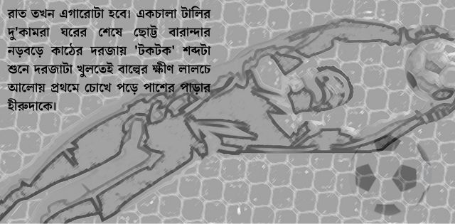 রাত তখন এগারোটা হবে। একচালা টালির দু’কামরা ঘরের শেষে ছোট্ট বারান্দার নড়বড়ে কাঠের দরজায় ‘টকটক’ শব্দটা শুনে দরজাটা খুলতেই বাল্বের ক্ষীণ লালচে আলোয় প্রথমে চোখে পড়ে পাশের পাড়ার হীরুদাকে। তাকে দেখে অবাক হওয়ার আগেই হীরুদা বলে, “শুয়ে পড়েছিলিস?”