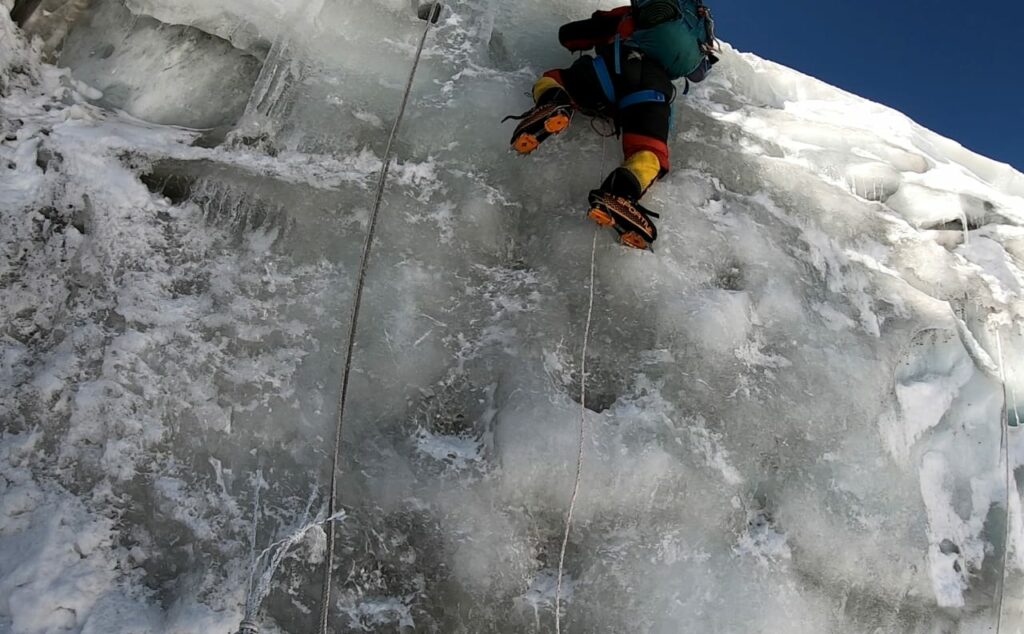 পুরো পথটাতেই দড়ি লাগানো ছিল। সেই রোপে জুমার, সেফটি লাগিয়ে ওঠা। একই দড়িতে আগে পরে অনেক ক্লাইম্বার। মাঝেমধ্যেই বেশি কষ্টকর জায়গায় কেউ না কেউ দাঁড়িয়ে বিশ্রাম নিচ্ছে, স্বভাবতই পিছনের লোকেরাও দাঁড়িয়ে যাচ্ছে। ফলে তৈরি হচ্ছে জ্যাম। এ রকম জ্যাম এ পথে খুব স্বাভাবিক। এরই নাম ‘হিউম্যান ট্রাফিক জ্যাম’। ইয়োলো ব্যান্ডের পর ফের বেশ খাড়া বরফের ঢাল। খাড়া ওঠার পর বাঁ-দিকে ট্রাভার্স, পথ বেঁকে গেছে বাঁদিকে। সে সময় সামনে দেখি এক মন খারাপ করা দৃশ্য।