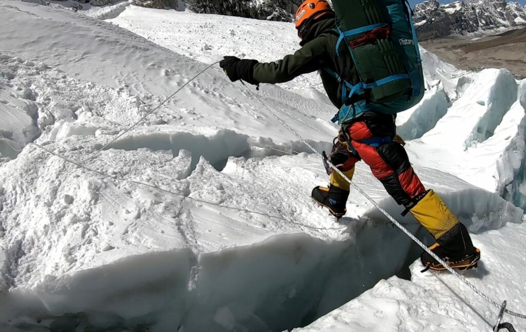ক্রিভাসের উপর যে মই পাতা হয়, তার উপর দিয়ে যাওয়ার এক সুন্দর টেকনিক আছে। মই এর দু’পাশে দুটো দড়ি ফেলে রাখা থাকে। অভিযানে চলার জন্য যখন আমরা তাঁবু থেকে বের হই, তখন কিছু সরঞ্জামে ঠিকঠাক সুসজ্জিত হয়ে আমাদের বের হতে হয়। সেই সাজের এক জরুরী জিনিস হার্নেস। দুই পা ও কোমর জড়িয়ে থাকে এই হার্নেস। হার্নেসে আমরা স্লিং এর সাহায্যে আরোহণের বিভিন্ন সরঞ্জাম, যেমন জুমার, ডিসেন্ডার, আইস অ্যাক্স, ক্যারাবিনার লাগিয়ে নিই। আর হাত দুয়েক লম্বা এক দড়ির টুকরো, যাকে বলে ‘স্লিং’, তার সাহায্যে আলাদা একটা ক্যারাবিনারও হার্নেসের সাথে বেঁধে নেওয়া হয়। একে বলে সেফটি। অনেক সময় আমরা কোমরে দুটো সেফটিও ব্যবহার করি।