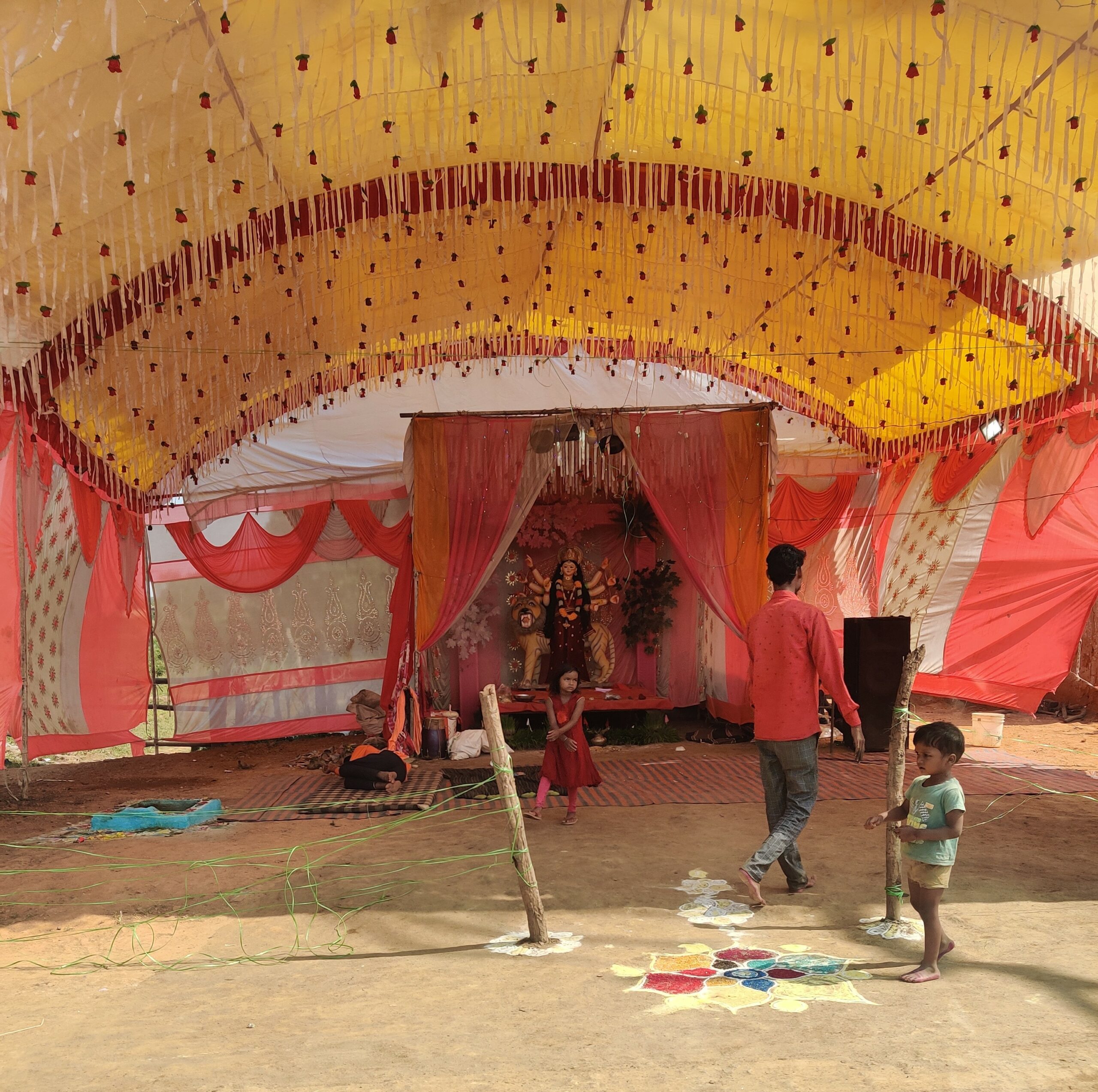 ইতিমধ্যে দুর্গাপুজো শুরু হয়ে গেছে। মধ্যপ্রদেশে শহরে গ্রামে সর্বত্রই দুর্গাপুজো হয়। এখানে দুর্গার আটটি হাত, তিনি সিংহের উপর বসে আছেন। পদতলে মহিষাসুর বা অন্য কোন অসুর নেই, নেই দুই ধারে লক্ষ্মী-সরস্বতী-গণেশ-কার্তিক। এখানকার প্যাণ্ডেল বাঁশ দিয়ে বাঁধা নয়, লোহার রডের খাঁচা বানিয়ে রঙিন কাপড়ে আচ্ছাদিত। বেশ ধুমধাম করে পুজো চলছে।