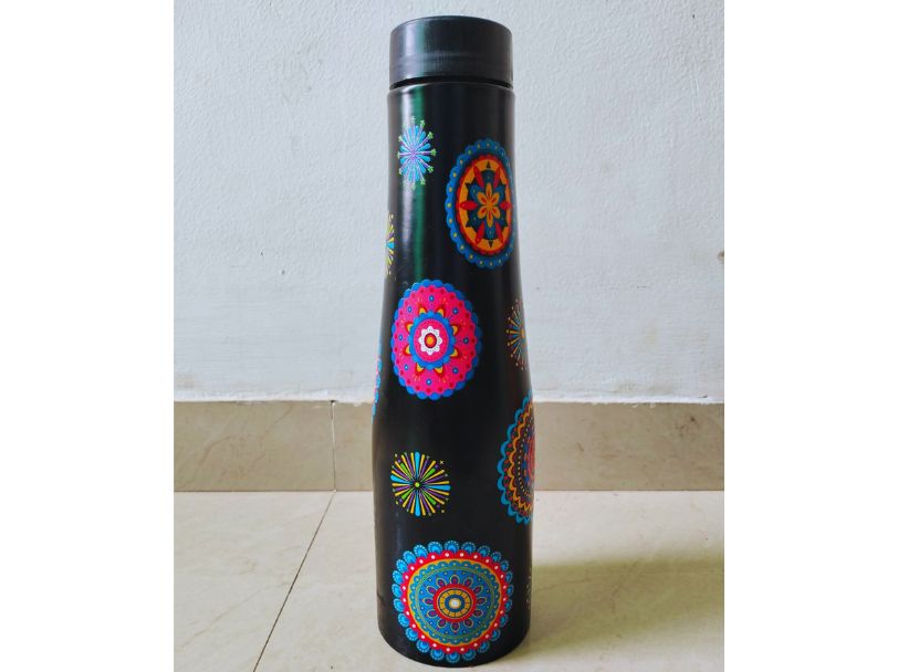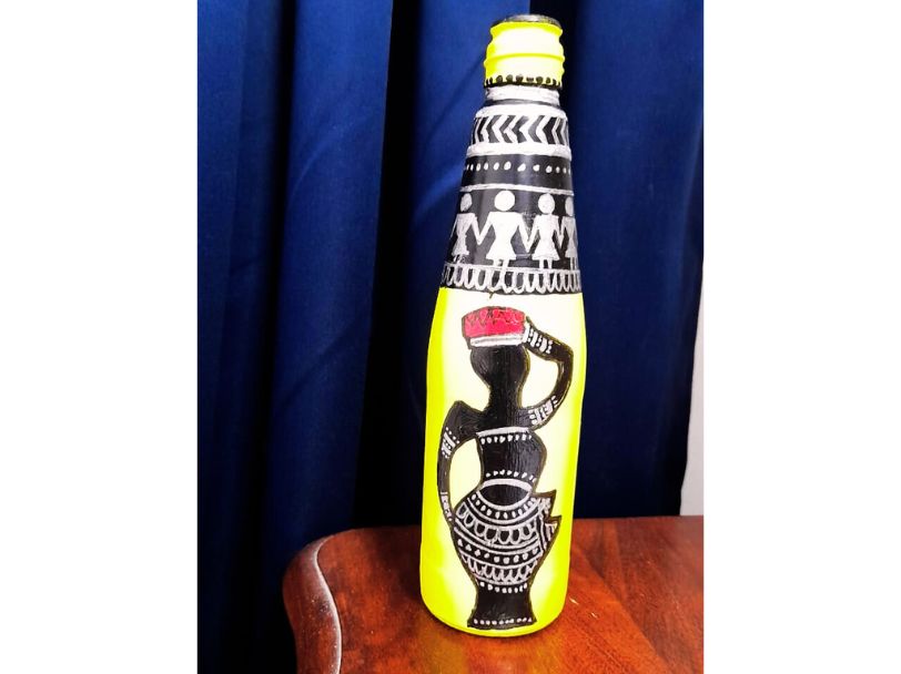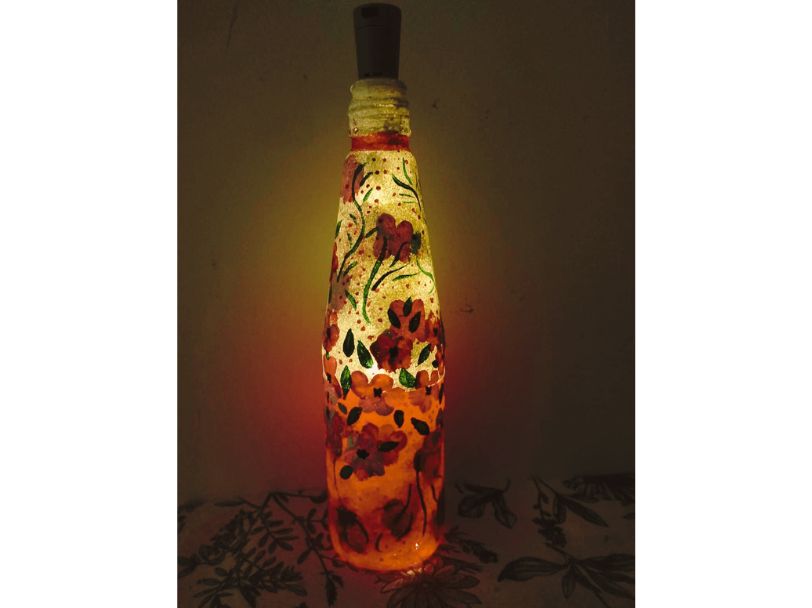 প্রণালীঃ বোতল ভালো করে ধুয়ে পরিষ্কার করে শুকিয়ে নিয়ে ওই বোতলের গায়ে কালো রং করে নিতে হবে। রং শুকিয়ে গেলে তার মধ্যে বিভিন্ন রং দিয়ে এঁকে নিলে বোতল তৈরি।