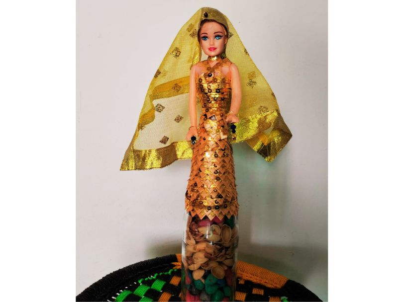 প্রণালীঃ প্রথমে বোতল ভালো করে ধুয়ে পরিষ্কার করে শুকিয়ে নিতে হবে। বোতলের মধ্যে ছোটো ছোটো রঙিন পাথর, পেস্তাবাদামের খোলা ভরে দিতে হবে। এবার বোতলের মুখ দিয়ে পুতুলটা বোতলের ভিতরে ঢুকিয়ে দিতে হবে। এবার লেস দিয়ে বোতলের অর্ধেক অংশ থেকে মুড়ে দিতে হবে এবং ফেভিকল ও আলপিন দিয়ে লেসটা আটকে দিতে হবে। নেট দিয়ে পুতুলের মাথায় সাজিয়ে দিতে হবে।