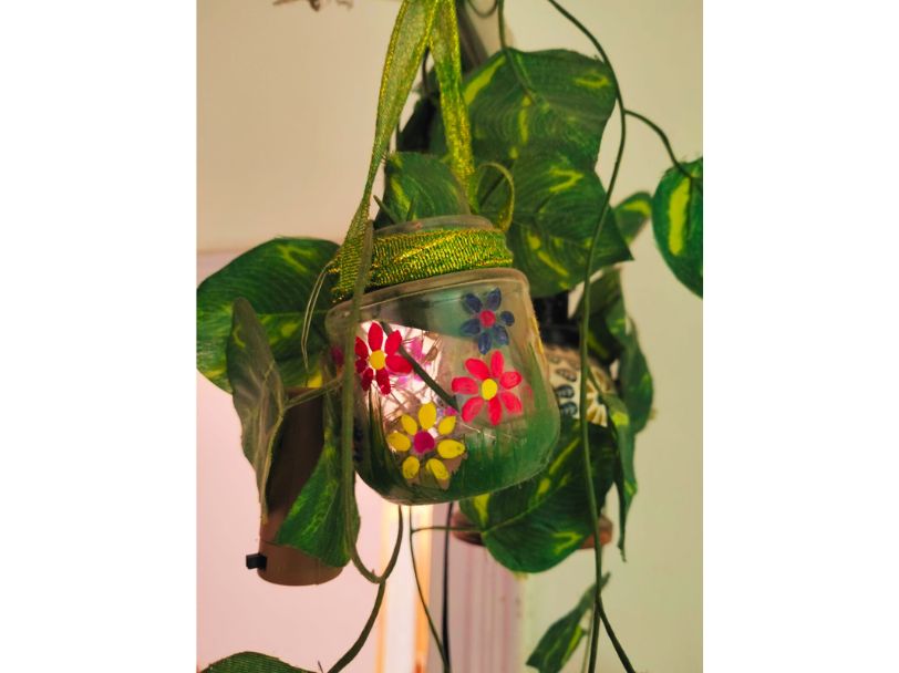 প্রণালীঃ শিশি ভালো করে ধুয়ে পরিষ্কার করে শুকিয়ে নিতে হবে। শিশির গায়ে এক্রেলিক কালার দিয়ে পছন্দ মতো ডিজাইন করতে হবে। এবার লেস দিয়ে শিশির মুখের দিকে ভালো করে পেঁচিয়ে দিতে হবে এবং ওর মধ্যে কৃত্রিম মানি প্ল্যান্ট সাজিয়ে দিতে হবে।