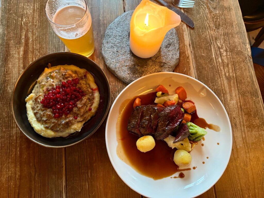 নেপাল থেকে কাজ করতে আসা দাদা, যিনি নরওয়েজিয়ান আর ইংরিজিই বলছিলেন, ওনাকে খাবার আনতে বললাম। Hvalbiff এইচ না ভি কোনটা কীভাবে উচ্চারণ করব। নেপালি দাদা কায়দা করে কইলেন ‘ভালবিফ’… হোয়েল স্টেক, একটা ওনিয়ন সস আর সঁতে করা সবজি, আলুর সাথে চলে এলো। আর এলো ফিনবিফ (Finnbiff) …বলগা হরিণের স্বাদু মাংস, নুন মরিচ,মাখন তেলে হালকা ভেজে, ক্রিম মাখিয়ে ভালো করে সেদ্ধ করা। সার্ভ করলো দুর্দান্ত একটা আলু সেদ্ধ মাখা আর ছোট্ট লাল লিঙ্গনবেরির সাথে। (Norway)