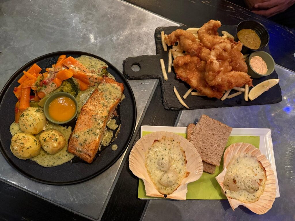 খেলাম। অবশ্যই Norwegian Salmon বেকড, ফরেস্টার চিজ প্যাপ্রিকা দিয়ে গ্রেটিনেটেড সঙ্গে কিছু সঁতে করা সবজি আর আলু বেকড। Arctic fish and chips – ক্লিপ ফিশ দিয়ে ফিশ এন্ড চিপস। আর Norwegian Scallops Gratin ,স্ক্যালপের খোলায় পরিবেশন করা। নরওয়েজিয়ান স্ক্যালপ সমুদ্র থেকে ফ্রেশ তুলে আনে ডাইভাররা। (Norway)