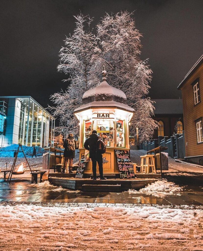 লাঞ্চ সারতে সারতে সূর্য ডুবে গেল। সন্ধ্যে নামল শহরে। হঠাৎ ব্যস্ত রাস্তার মাঝখানে চোখে পড়ল ছোট্ট একটা বার! বসার কয়েকটা জায়গা বাইরে। চারপাশে বরফ ঘেরা। আমরা শুধু রেইন ডিয়ার হটডগ আর হট চকলেট খেলাম। বারের নাম Raketten bar, পৃথিবীর সব চেয়ে ছোট বার। (Norway)