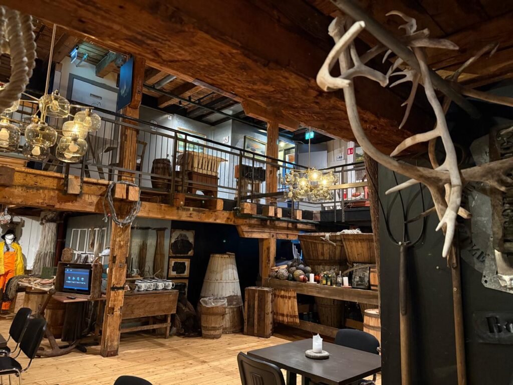 এক পা হাঁটলেই হার্বার। আর ধার দিয়ে আরেকটু এগোলেই একটা দারুণ রেস্তোরাঁ, ‘ফুল স্টিম’। বল্গা হরিণের সিং, ফিশারম্যানদের নৌকো, পিপে সারি সারি, আর শুকনো মাছ, কিন্তু কোনও বিকট গন্ধ নেই। অ্যাম্বিয়েনস এমন মনে হবে এই নৌকো করে মাছ ধরে এনে খাচ্ছি। (Norway)