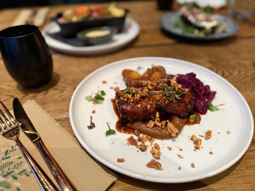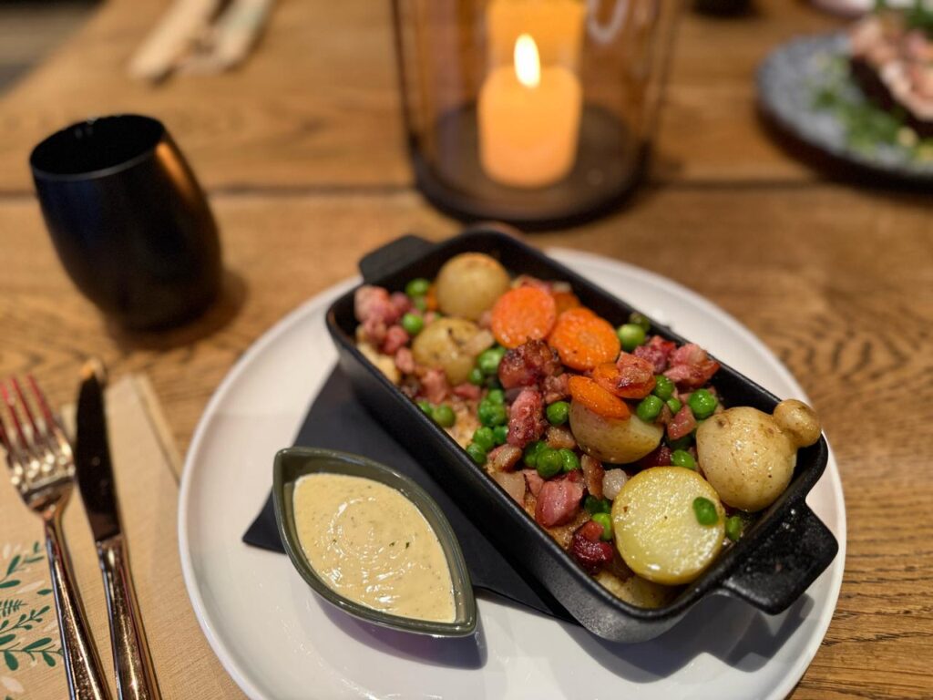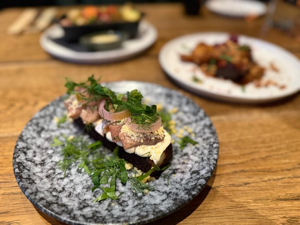 Slow cooked pork belly, লাল বাঁধাকপি আপেল, সেলেরি, ওরেঞ্জ সস, রোস্টেড পটাটো আর ওয়ালনটস দিয়ে Verkstedets pickled herring and potato, একটা পটাটো কেকের নিচের লেয়ার, যেরকমটি আগে খাইনি।বাইরে মুচমুচে ব্রাউন আবরণ আর ভিতরে নরম আলু, তার ওপরে পিকল্ড হেরিং, পিকল্ড ওনিয়ন আর দিল লিভস ছড়ানো। (Norway)