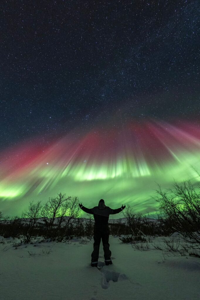 রওনা দিলাম, কিন্তু মনে মনে জানি, ড্যানসিং অরোরা না দেখতে পেলে সব কিছুই হয়তো বিস্বাদ লাগবে। তারপরের গল্পটা একদম রূপকথার মতো। বরফে মোড়া শহর ট্রমসোতে নামার আগেই উড়োজাহাজ থেকে কীভাবে লেডি অরোরা আমাদের মন মুগ্ধ করলেন, এবং পর পর কয়েকদিন বিমোহিত করে রাখলেন – সেই সব কথা। সেদিন মাঝরাতে এক আকাশ তারা আর সবুজ লাল আলোর নীচে কনকনে ঠান্ডায় বরফে শুয়ে ছিলাম অনেকক্ষণ। কীরকম একটা ভারমুক্ত লাগল। পর পর তিন রাত জাগব বলে হালকা খাবার খাচ্ছিলাম। অতএব ভারমুক্ত মন বলল, বেশ খানিক ঘুমিয়ে কাল থেকে লেগে পড়ো খাদ্য অভিযানে। (Norway)