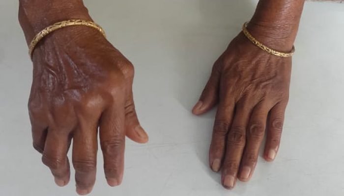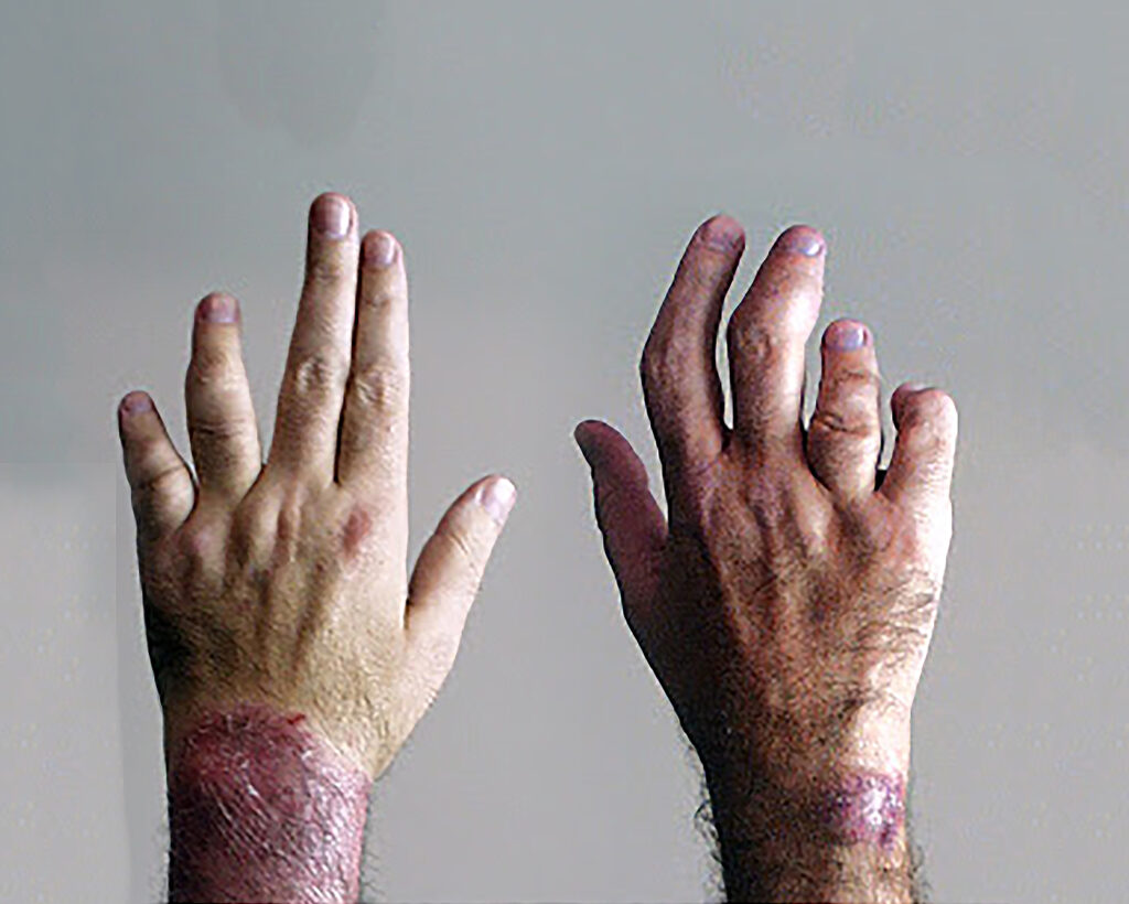 রিউম্যাটয়েড আর্থ্রাইটিস, এক্ষেত্রে সাধারণতঃ দুটো হাতই আক্রান্ত হয়। এটি জিন সম্পর্কিত রোগ। তাই পুরোপুরি সারানো যায় না। এই রোগ যৌবনে বা মধ্যবয়সে শুরু হতে পারে। মহিলাদের বেশি হয়। সকালের দিকে ব্যথা বেশি হয়। হাত মুঠো করতে অসুবিধা হয়। বিশ্রামে থাকলে ব্যথা বেড়ে যায়। কাজের মধ্যে থাকলে ব্যথা কমে। চিকিৎসা শুরু করতে দেরি হলে হাতের আঙুল, কব্জি খুব বেঁকে যেতে পারে। ব্যথা, ফোলা এবং বেঁকে যাওয়ার কারণে হাত অকেজো হয়ে যেতে পারে। তাই দ্রুত ডাক্তারের পরামর্শ নিতে হবে। রক্ত পরীক্ষা, এক্সরে ইত্যাদির মাধ্যমে রোগ নির্ণয় করে রিউম্যাটয়েড আর্থ্রাইটিসের ওষুধ শুরু করতে হবে। এইসব ওষুধ চিকিৎসকের পরামর্শ ছাড়া খাওয়া উচিত নয়। রিউম্যাটয়েড আর্থ্রাইটিসের ওষুধ বহুদিন, এমনকি সারাজীবন খেতে হতে পারে। এছাড়া প্রয়োজন মতো ব্যথার ওষুধ, বরফ লাগান, স্প্লিন্ট, ব্যায়াম, ফিজিওথেরাপি করতে হয়।