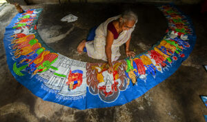 বছরের এই সময়টা, তিনি বেশি ব্যস্ত, কারণ ‘দুর্গা’ তার বাপের বাড়ি আসছে। ৭৮ বছর বয়সেও রেবা পাল (Reba Pal) তার ছোট্ট বাড়িতে হাতে আঁকা চালচিত্রের (ChalChitra) ঐতিহ্যবাহী শিল্প বজায় রেখেছেন। এখন আগের মতো একটানা কাজ করতে পারেন না শারীরিক কারণে। চালচিত্র আঁকতে আঁকতেই জানাচ্ছিলেন কীভাবে এই কাজের সঙ্গে তিনি জড়িয়ে পড়েন।