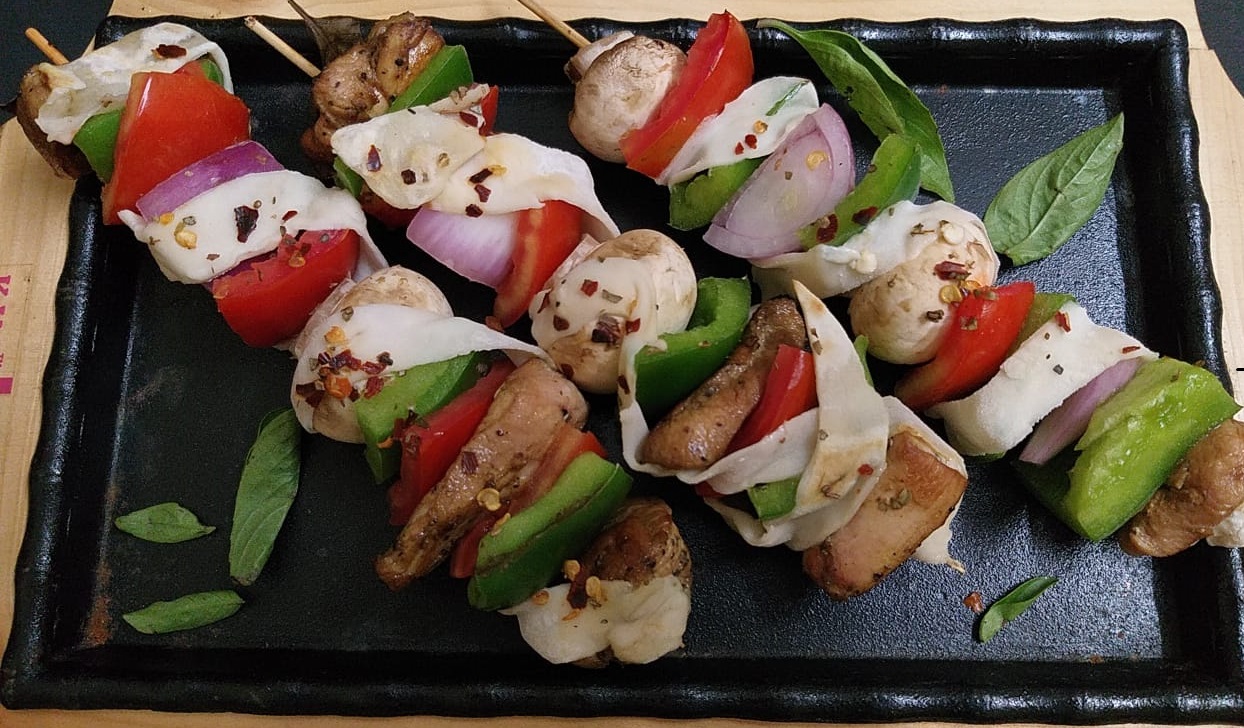 উপকরণ: গোটা চেরি বা গ্রেপ টোম্যাটো ৩ কাপ, সবুজ ক্যাপসিকাম ৩টে (এক ইঞ্চি করে কাটা), বাটন মাশরুম ২ কাপ,চিকেন কিউব আধ কাপ (লেবুর রস, মধু আর নুন দিয়ে গ্রিল করা), বেসিল পাতা ১/৪ কাপ, পিৎজা ডো (ইস্ট, জল আর ময়দা একসঙ্গে মেখে, কিছুক্ষণ ঢেকে রেখে তৈরি করা যায়), এক্সট্রা ভার্জিন অলিভ অয়েল ২ টেবলচামচ, ইটালিয়ান সিজনিং ১ টেবলচামচ, মোৎজারেলা চিজ কুরানো ১ কাপ, গোলমরিচ গুঁড়ো অল্প, কাঠের স্কিউয়ারস ১০টা, নুন স্বাদমতো, টোম্যাটো সস আধ কাপ ও ভিনিগার ১/৪ চা-চামচ মেশানো।