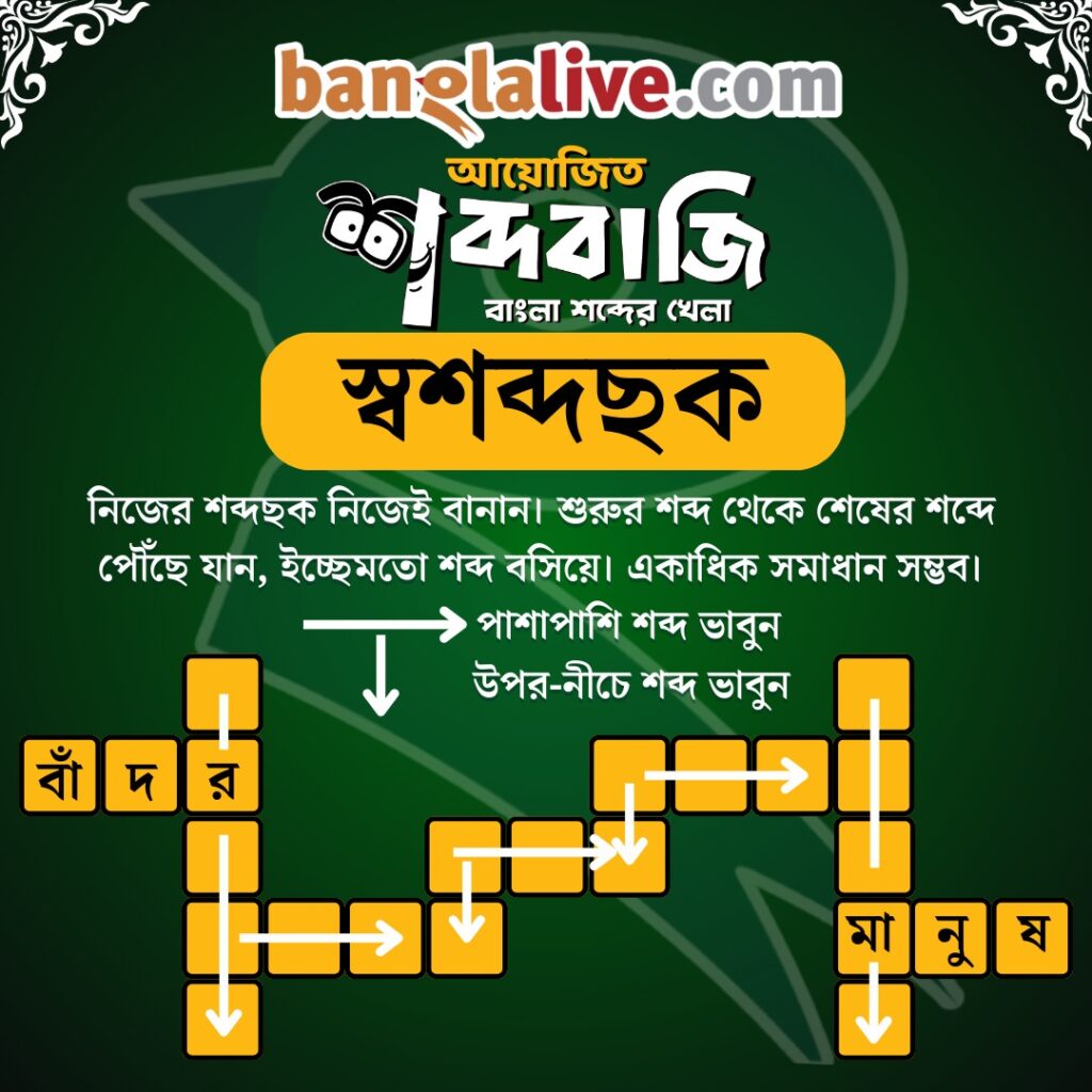 বাংলালাইভ এবং Shabdabaaji – শব্দবাজি -র যৌথ উদ্যোগে আজকের খেলা স্বশব্দছক। নিজের ইচ্ছেমত শব্দ বসান। হবে একাধিক সমাধান। সঠিক উত্তরদাতাদের মধ্যে পাঁচজন সৌভাগ্যবান বিজয়ী পেয়ে যাবেন আকর্ষণীয় পুরস্কার l তাহলে আর দেরি কেন? খেলতে থাকুন