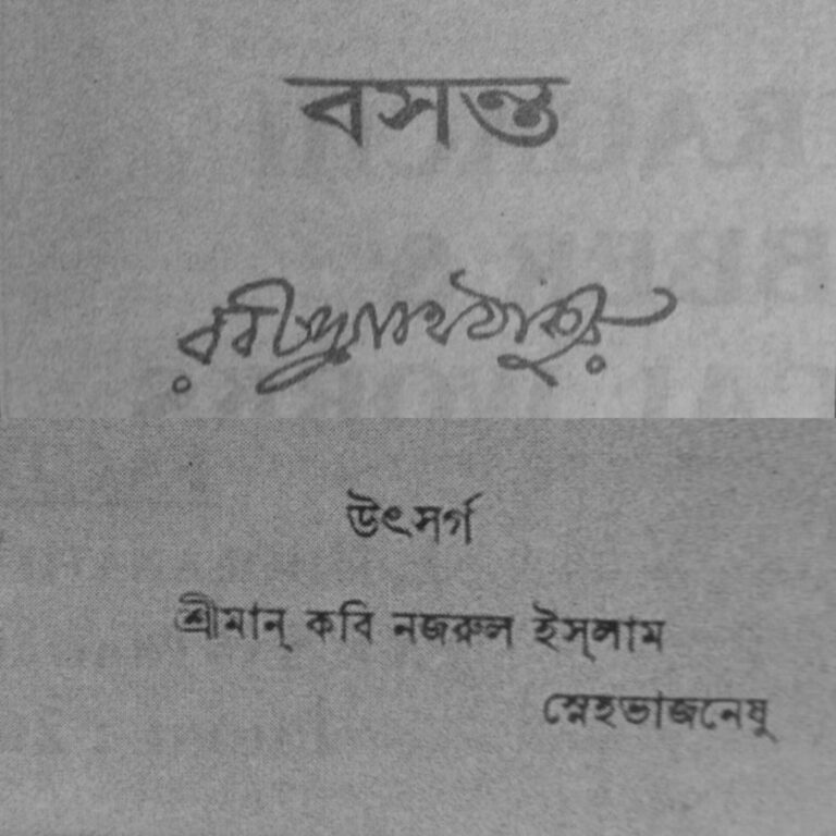 ঋতুরাজ বসন্তের সঙ্গে রবীন্দ্রনাথের সম্পর্ক অশোক, পলাশ, পিকরবের মতোই একাত্ম হয়ে আছে। বসন্ত সৃষ্টির ভাণ্ডার। আর কবিও তাঁর সৃষ্টিসম্ভারে, এই সৃষ্টিশীল কালকে স্বীকৃতি দিয়েছেন হৃদয় উজাড় করে। যে দুটি ঋতু রবীন্দ্রনাথকে সবচেয়ে বেশি আলোড়িত করেছিল, সেই বর্ষা ও বসন্ত, দুটিই সৃষ্টির সময়। প্রথমটি ফসল ফলায় আর অন্যজন সেজে ওঠে পুষ্পশোভিত ও পত্রমুখরিত হয়ে। দুটি কালেই যেন চারপাশ ‘পাওয়া’-র তৃপ্তিতে পূর্ণতা পায়। বসন্ত নিয়ে রবীন্দ্র-সৃষ্টির অফুরন্ত সম্ভারের মধ্যে ‘বসন্ত’ গীতিনাট্য অন্যতম, যার আবেদনে বসন্ত এক অন্য মাত্রা পেয়েছে। কবি এটি উৎসর্গ করেছিলেন তাঁর স্নেহভাজন কাজী নজরুল ইসলামকে। এই উৎসর্গীকরণকে এক অর্থে বেশ তাৎপর্যপূর্ণ ঠেকে।