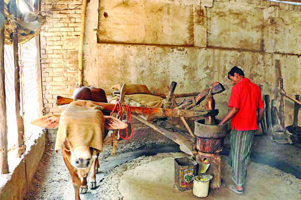 বলদের চোখে ঠুলি পরানো সেই কলুর ঘানির তেল আজ অতীত। ছবি সৌজন্য – kalerkontho.com