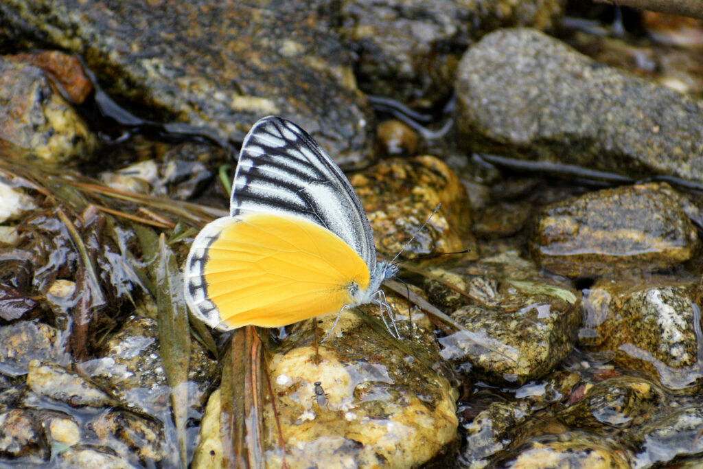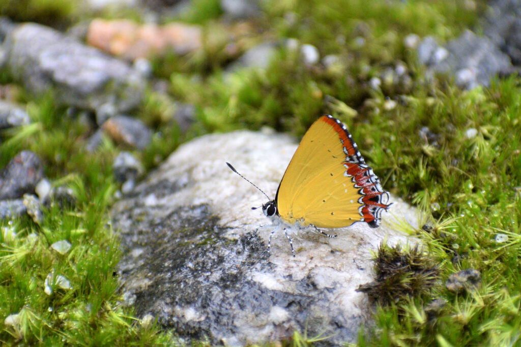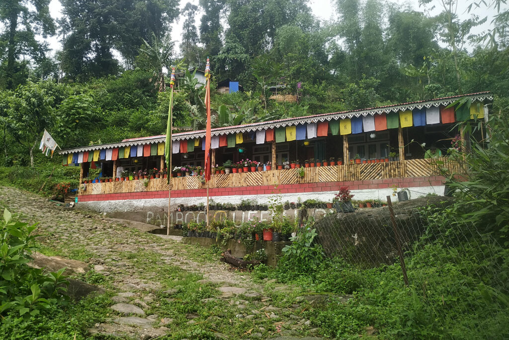 বিনোদ রাই গাড়ি নিয়ে হাজির। ব্রেকফাস্টের পর বেড়িয়ে পড়লাম রঙ্গোর উদ্দেশ্যে। পথে একজোড়া ফ্রকটেল পাখি দেখলাম ঝরনার কাছে খেলা করছে। রঙ্গোতে আমাদের থাকার ঠিকানা ‘ব্যাম্বু কুইন হোমস্টে’। এর কিছুটা আগে গাড়ি থেকে নেমে হাঁটতে লাগলাম। পথে মাইম প্রজাপতির পাডলিং দেখে বিভোর হলাম। নামতে নামতে দেখছি বাঁশ দিয়ে রানীর মতো সাজানো হোমস্টে। ব্যাগপত্তর রেখে লিকার চা খেয়ে বেড়িয়ে পড়লাম চারপাশটা দেখতে। ঢিল ছোঁড়া দূরত্বে ঝালংখোলা বয়ে চলেছে আপনমনে। তার কাছাকাছি যেতেই একটা ফাঁকা জায়গায় বেশ কয়েক প্রজাতির প্রজাপতির ভিড়। সামনে অনেক উঁচু গাছের সারি।