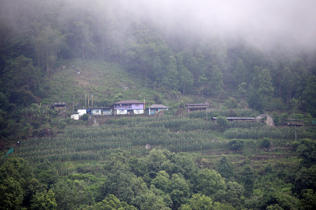 একটা ‘ব্লু-হুইশ্লিং থ্রাশ’ পাখি একমনে জলের ধারে বসে গান গাইছিল, কাছে যেতেই উড়ে পালাল। পাথরের উপর দিয়ে নদী ডিঙিয়ে নামলাম নীচে। স্নান সেরে বাইরের খোলা বারান্দায় খেতে বসেছি, তুমুল ঝড়বৃষ্টি শুরু হল। দুপুর পেরিয়ে সন্ধ্যা অবধি বৃষ্টি চলল। বৃষ্টিতে ঝালংখোলার জলের স্রোত বেড়ে গেছে। রুমের মধ্যে বসে তার জলের তোড় শুনছি। সে রাত্রে আর আলো আসেনি। হোমস্টেতে বসে বাইরের প্রকৃতিকে মনের চোখ দিয়ে অনুভব করছিলাম। ব্যাঙ আর ঝিঁঝিঁদের গান শুনতে শুনতে বাইরে এসে দূরে পাহাড়ের কোলে আলো ঝলমলে ভুটানি গ্রাম দেখতে পেলাম।