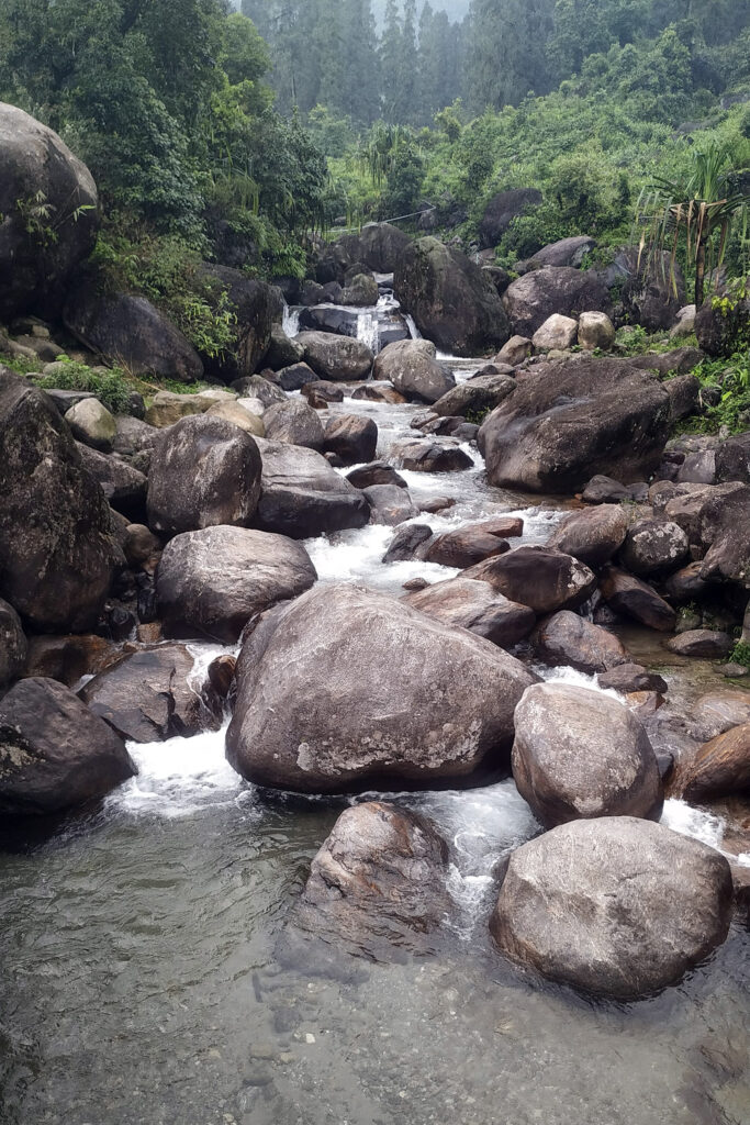 আমরা পৌঁছতেই বৃষ্টি নামল ঝেঁপে। ওপারে ভুটানের পাহাড় আর মাঝে বয়ে চলেছে চুমাং বা দাওয়াইখোলা নদী। নদীবক্ষে নুড়ি পাথরের সাথে সবুজের বন্ধুত্ব দেখে মন জুড়িয়ে গেল। হোমস্টে চালান নামগেল ভুটিয়া আর তাঁর ছেলে মার্টিন। কী মিষ্টি হাসি ছেলেটির!